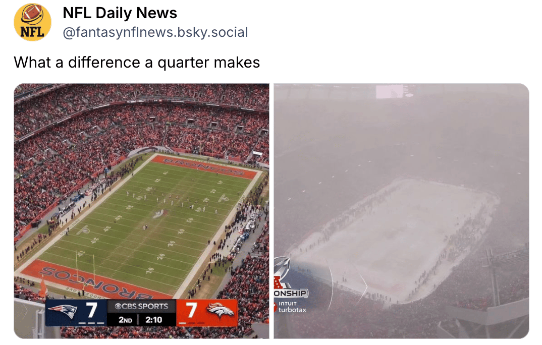 The Seahawks-Rams matchup was fairly mild weather-wise. Nothing compared to the AFC game, which we’ll talk about below.